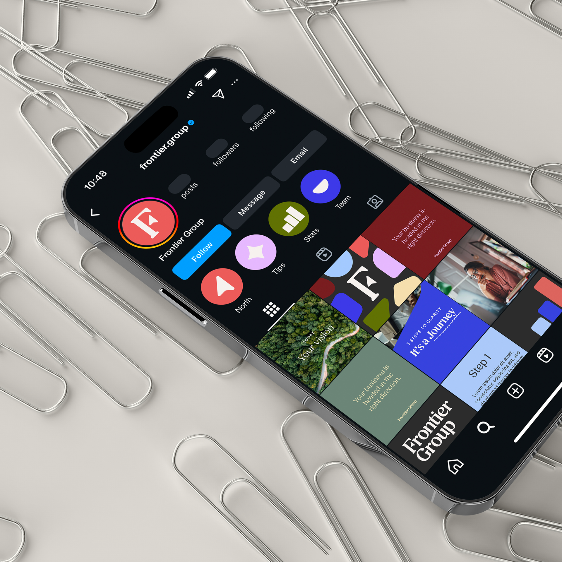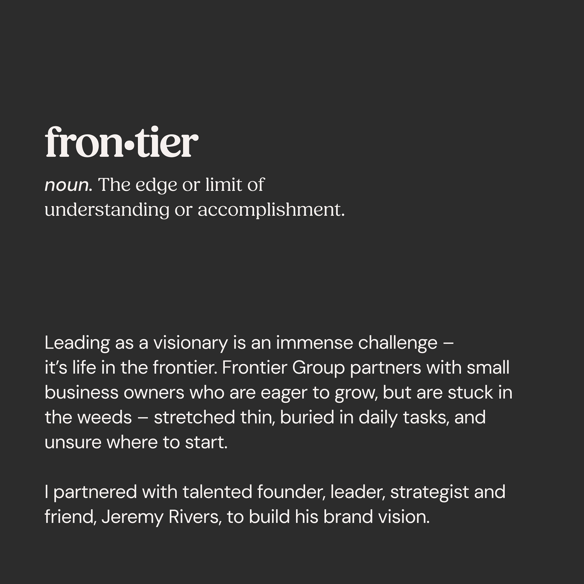 "Leading as a visionary is an immense challenge – it’s life in the frontier." Frontier Group partners with small business owners who are eager to grow, but are stuck in the weeds – stretched thin, buried in daily tasks, and unsure where to start. In 2024, I partnered with talented founder, leader, strategist and friend, Jeremy Rivers, to build his brand vision. With “alignment” as a driving visual concept, the design language hinges on the simplicity of the arrow form, expanding the visual identity with tactile shapes, bold earthy colors, and a friendly nostalgic typeface, Fields.