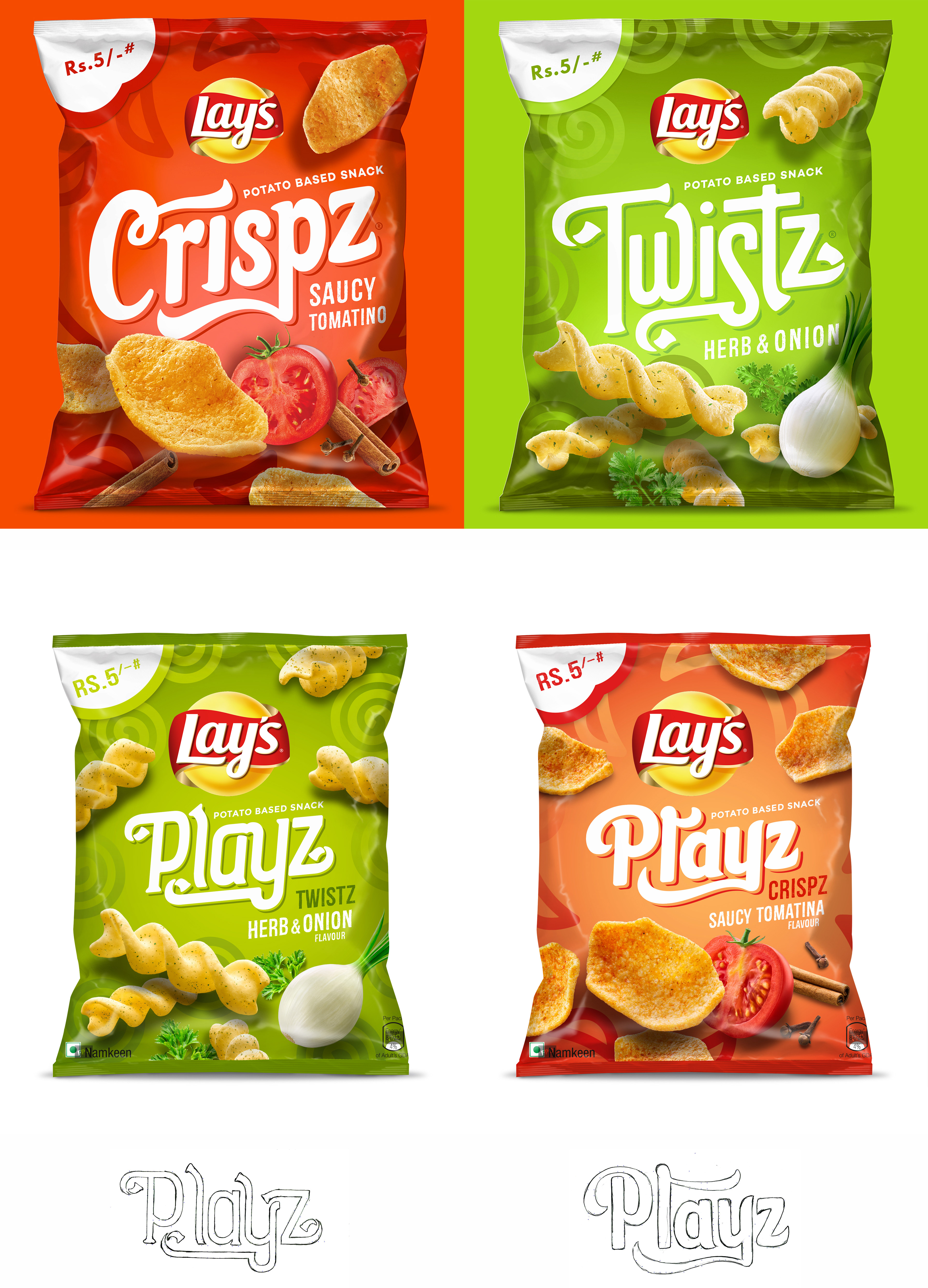 I was hired by Pearlfisher, NYC, to create a package design including the lettering of the Lay's Crispz, Twistz, and Playz products. Sold in India and surrounding regions. 2017.